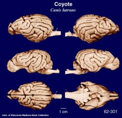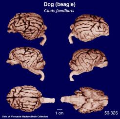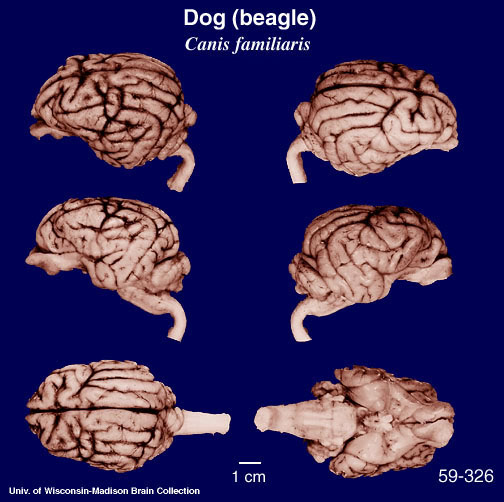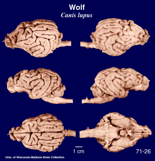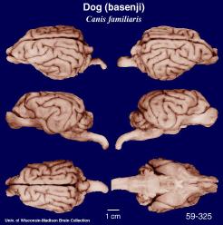 Die Gehirne von Wolf, Coyote, Beagle und Basenji sind sich sehr ähnlich. Insbesondere das Gewicht der Gehirne ist trotz der unterschiedlichen Körpergröße der verschiedenen Arten innerhalb einer Bandbreite von +/- 15 v.H. gleich. Diese geringe Schwankung liegt in der individuellen Toleranz. (Zum Vergleich, beim Menschen schwankt das Gehirngewicht auch individuell um diesen Wert, wobei die extremsten Unterschiede bei beinahe 100 v.H. liegen können.)