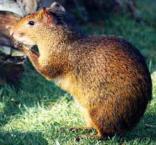 Die Gene am Locus A sind verantwortlich für die sogenannte Aguti-Serie (ursprüngliche Wildfärbung nach dem südamerikanischen Nagetier Aguti (Foto) benannt) und beeinflussen die relative Menge von dunklem Pigment zu hellem Pigment im einzelnen Haar und somit im gesamten Erscheinungsbild des Basenji.