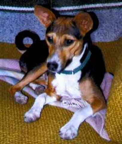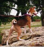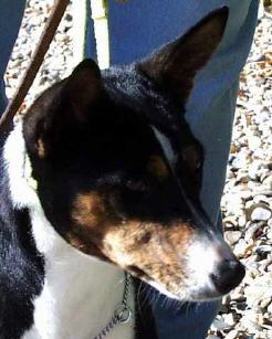 Weitere Schwarzausdehnungen können beim Basenji auch als Maske rund um die Schnautze auftreten (Foto links). Am gleichen Genort kann es auch zu einer rezessiven Genkombination kommen, die für die seltenen Rehbraunen Basenjis verantwortlich ist. Bei diesen fehlt das Pigment (Eumelanin), welches für die dunkle Färbung benötigt wird (Foto rechts und weitere Fotos hier ). |