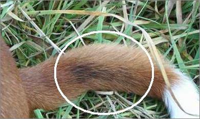 Unsere Hündin Jamilah zeigt ihr Tri-Gen deutlich an der Rute.