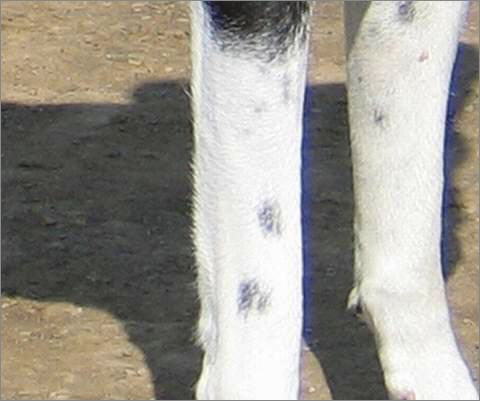 Dennoch kann es auch zu den anderen möglichen Ausprägungen der Scheckung kommen, die dieser Genort bestimmt. Diese währen die vollkommene Basisfarbe ohne Schecken, unregelmäßige Scheckung und die extreme weiße Scheckung (siehe Foto).