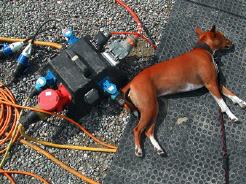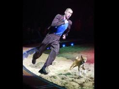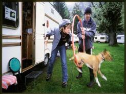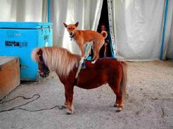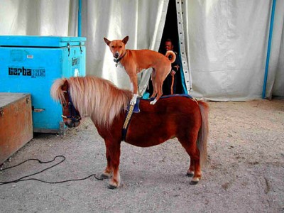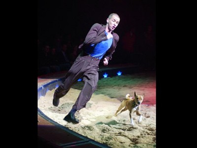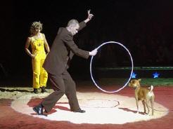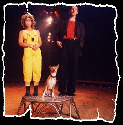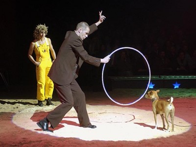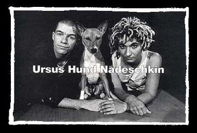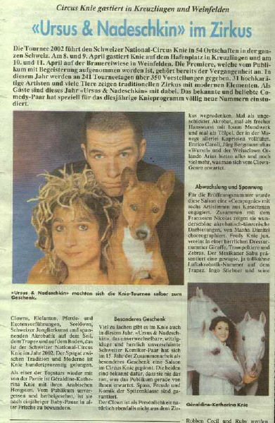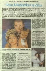 Bei unserem Urlaub am Bodensee im März 2002 haben wir in einer Lokalzeitung einen Artikel von einem Komikerpaar aus der Schweiz gelesen, daß auf einem Foto mit seinem Basenji für sich warb. Leider war unser Urlaub bereits zuende, bevor der Zirkus Knie, in dem die drei auftraten an dem Ort gastierte. So sind wir der Sache im Internet nachgegangen. Hier ist der Link auf einige Seiten der Website von Ursus & Nadeschkin aus der Schweiz. Ihr Hund Mocca begleitet sie auf alle Tourneen ....