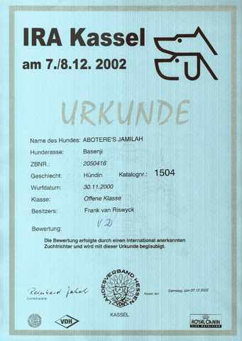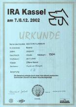 Am 07. Dezember 2002 ist Jamilah bei der IRA in Kassel in der offenen Klasse gestartet. In ihrer Klasse war nur noch eine weitere Hündin am Start. Also war uns der zweite Platz sicher.