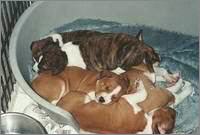 Von Jamilah' s fünf Geschwister sind zwei Hündinnen im Fell gestomt (brindle), wie der Vater. Die übrigen drei sind wie Jamilah rot/weiß. Jamilah hat in der Rute einige schwarze Haare. Diese sind das äußere Zeichen für ihre Veranlagung zum Brindle.